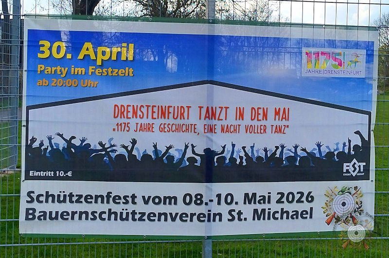 Die Vorbereitungen für unser diesjähriges Schützenfest vom 08.05. – 10.05. laufen bereits. Am vergangenen Samstagnachmittag traf sich der Vorstand, um die beiden Schilder an der "Dreingau-Halle" und Schützenstraße Ecke Josefstraße für das Schützenfest aufzustellen. Mit separat angerfertigen Werbebanner für "Drensteinfurt tanzt in den Mai" wurden die Schützenschilder ergänzt. Im Anschluss wurden auf der Vorstandsitzung in der Gaststätte "La Piccola" noch einige Details für das diesjährige Schützenfest und die Veranstaltung „Drensteinfurt tanzt in den Mai“ besprochen. Die Drensteinfurter Bevölkerung ist zu den Veranstaltungen herzlich willkommen.