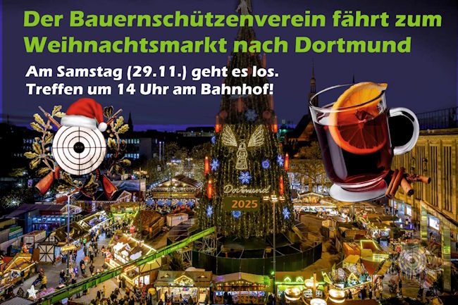Am 29.11. fährt der Bauernschützenverein traditionell am 1. Adventswochenende zum Dortmunder Weihnachtsmarkt. Hierzu treffen sich alle Interessierten um 14:00 Uhr am Drensteinfurter Bahnhof Fahrtrichtung Hamm. Die Rückfahrt erfolgt um ca. 19 – 20:00 Uhr.
